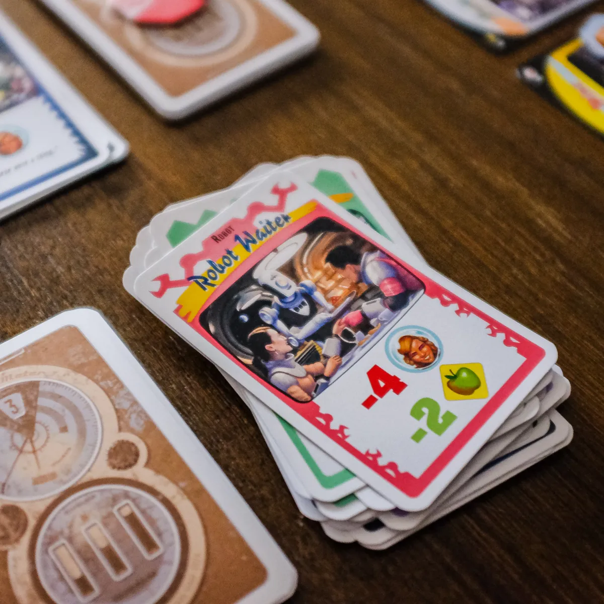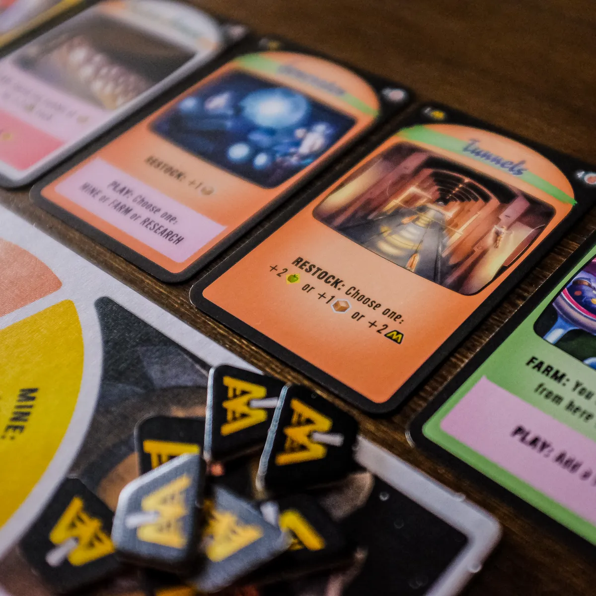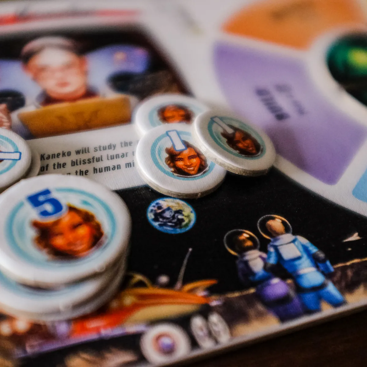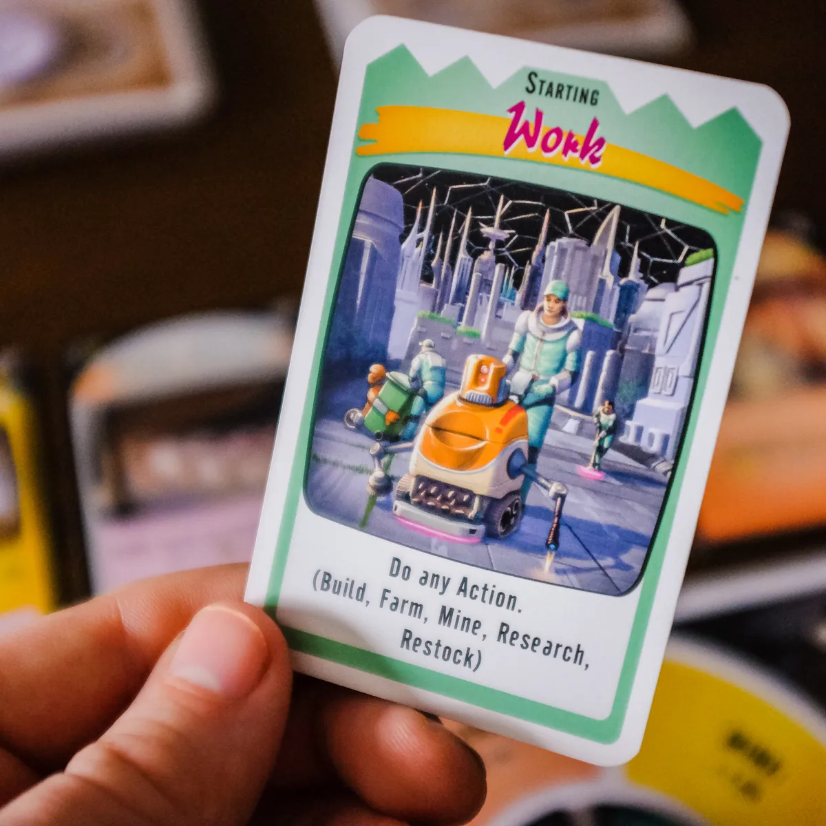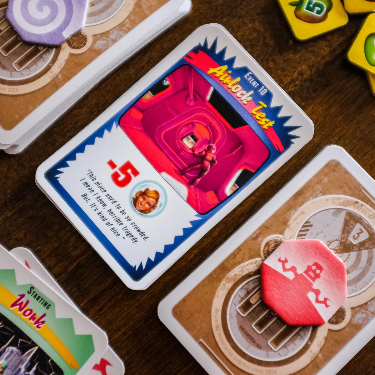 This is an engine-building engine-losing tableau game, with a shared deck the players build that makes things happen, many of them bad things that kill people in your moon colony, but some positive, and some that let you build up. The game lasts until one player’s moon colony has no people left in it, or the players reach the bottom of the Event deck; the player with the most survivors wins.